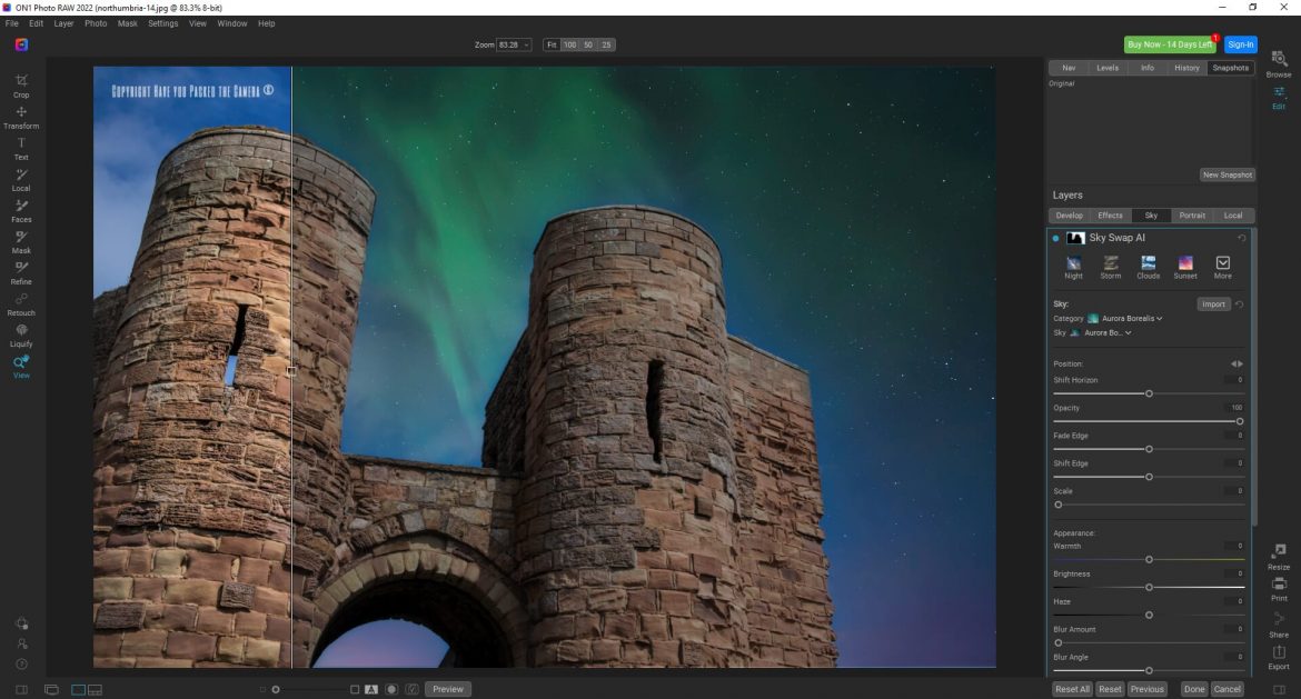 We also love the Sky AI tool. This appears to be better at creating masks than the ON1 Photo RAW 2022 Sky Swap tool. The software automatically creates a mask that selects the sky in your photo. You can then swap the sky out for a large range of preset sky images. The AI tool also changes the lighting and temperature of the photo to match the sky. It works really well and is quite impressive.